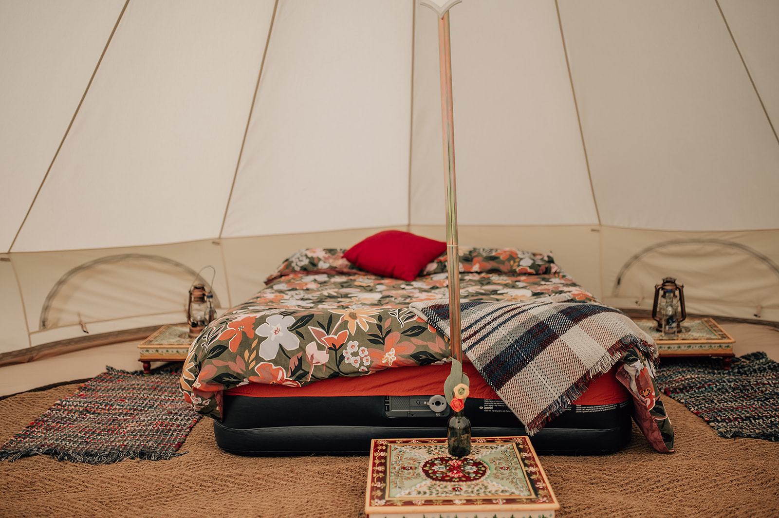 The Luxury package includes all the glorious interior furnishings of the classic package along with home luxuries such as bedding and deckchairs. This package can sleep up to 4. You can order any combination of single and double mattresses to suit your individual requirements. Each tent comes fully equipped with: Luxury double height inflatable mattresses Luxury bedding Super warm 13.5 Tog duvets Magical lighting including an old fashioned style LED hanging lantern Low level hand painted Bajot Table Hanging vanity mirror Bell Tent Matting Cosy Indian rugs Doormat and boot tray for your boots Solar fairy lights and bunting outside A traditional deckchair for each person in the tent Our Super Luxury Package includes all of the above, but in addition to luxury bedding and warm duvets you also receive a cosy throw/blanket and cushion set, fluffy towels and additional mood setting interior fairy lights. This package adds a touch of luxury to all aspects of your stay with a bistro twin set outside the tent (a table and 2 chairs) and to top it off a bottle of wine and glasses on arrival (non-alcoholic option available). This package sleeps up to 2 only in one of our 5m Bell Tents. What to bring: Just yourselves, no need to bring along heavy duvets or acrylic sleeping bags although a cosy throw if you get chilly at night would not go amiss to keep you super cosy! BOOK VIA https://brookbelltents.co.uk/product/arctangent/