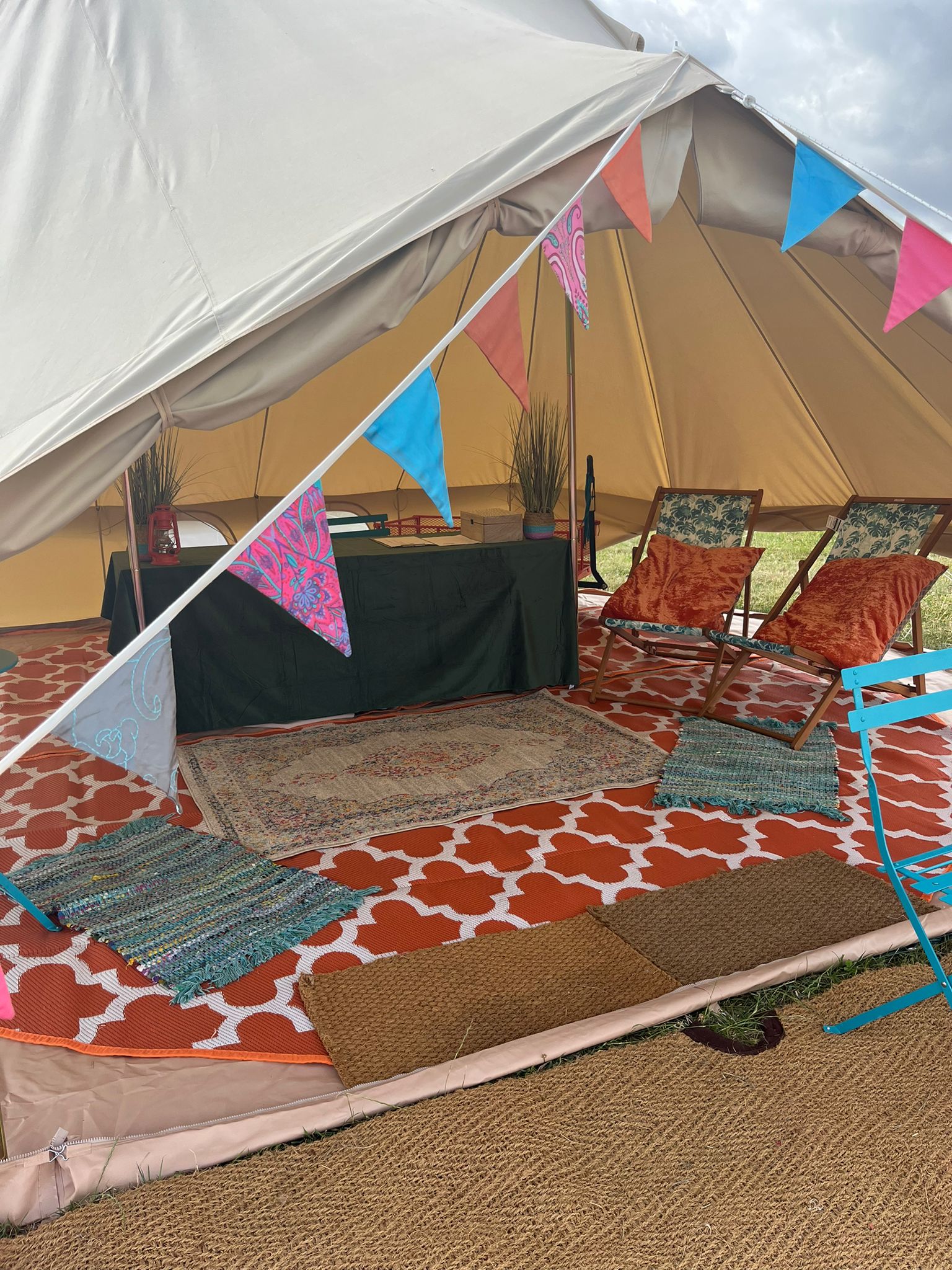 The Luxury package includes all the glorious interior furnishings of the classic package along with home luxuries such as bedding and deckchairs. This package can sleep up to 4. You can order any combination of single and double mattresses to suit your individual requirements. Each tent comes fully equipped with: Luxury double height inflatable mattresses Luxury bedding Super warm 13.5 Tog duvets Magical lighting including an old fashioned style LED hanging lantern Low level hand painted Bajot Table Hanging vanity mirror Bell Tent Matting Cosy Indian rugs Doormat and boot tray for your boots Solar fairy lights and bunting outside A traditional deckchair for each person in the tent What to bring: Just yourselves, no need to bring along heavy duvets or acrylic sleeping bags although a cosy throw if you get chilly at night would not go amiss to keep you super cosy! BOOK VIA https://brookbelltents.co.uk/product/arctangent/